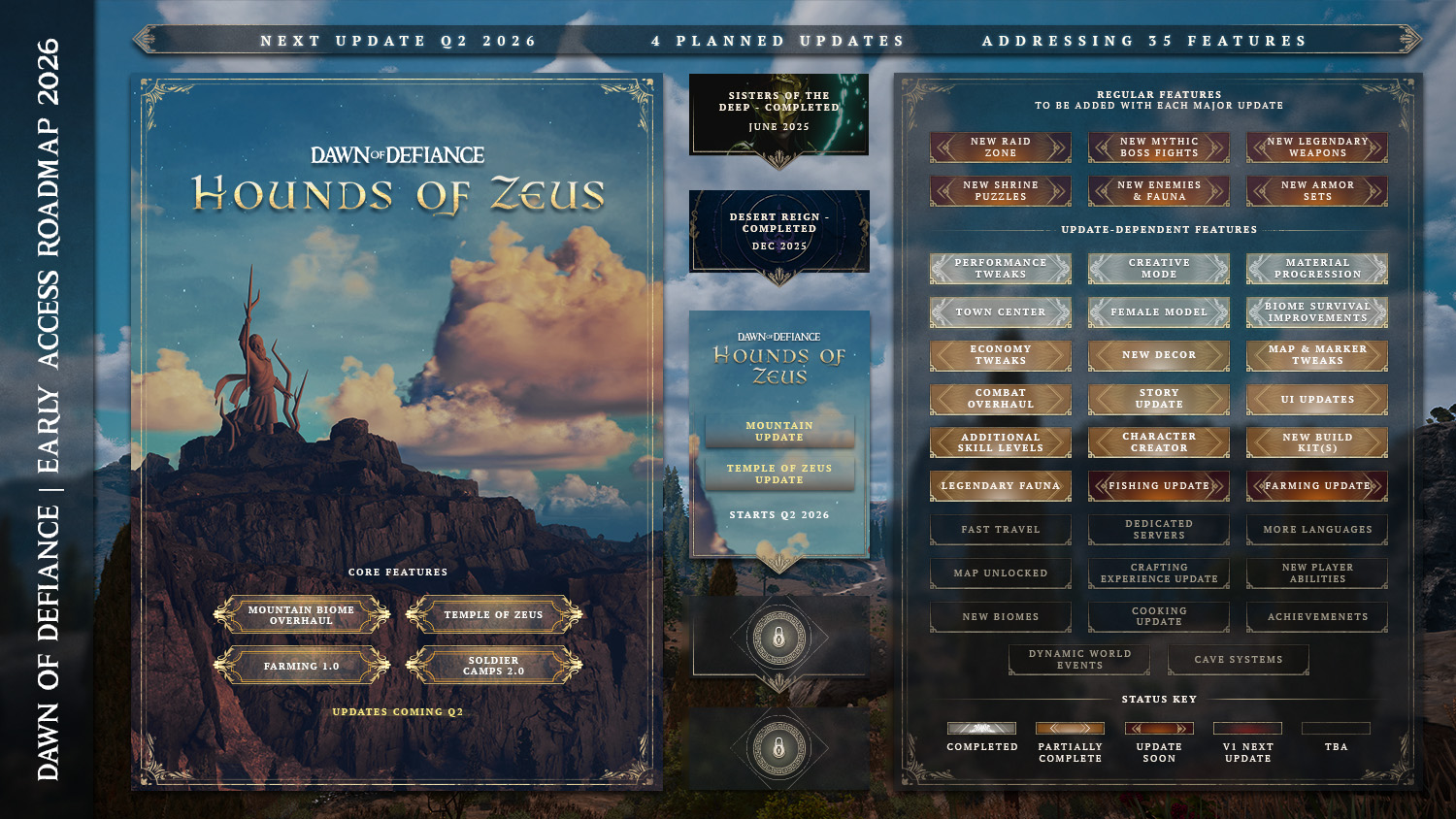Today, we also want to inform you of our next series of updates! Unlike “Desert Reign” and “Sisters of the Deep” which were singular, major updates, Dawn of Defiance “Hounds of Zeus” will be released in at least two parts, planning to start with the mountain biome overhaul in Q2 and culminating with the Temple of Zeus raid shortly after! This is mostly to improve efficiency, but we also hope it offers you more content, more often!