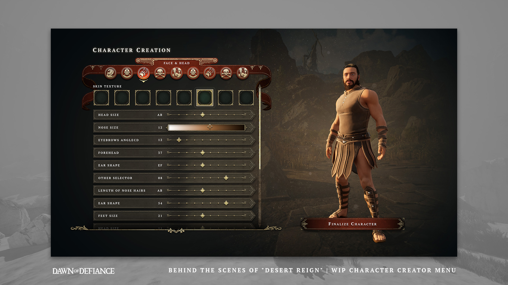 While we're still revising the UI menus and testing the integration of character creator, our directors answer a number of questions about how this new feature will function at its first iteration in "Desert Reign." The character creator will allow you to start from a collection of presets, then you'll have the option to adjust your model in 9 categories with non-destructive sliders for facial features like eyes, nose, mouth, skin, and others while allowing you to return to adjust your face shape at any time.