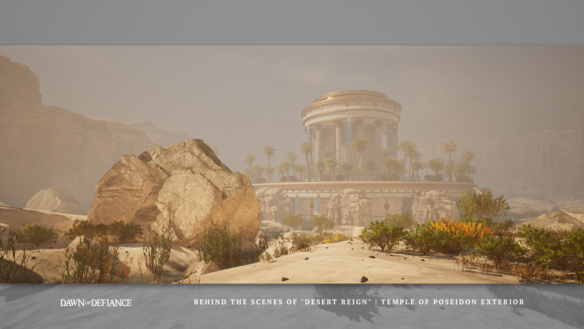 Like "Sisters of the Deep," this next major update "Desert Reign" will be overhauling one biome, in this case the Ancient Desert, plus adding a brand new raid zone: the Temple of Poseidon! The Crownbreaker teaser and the images below give you a glimpse of the Temple of Poseidon, a slice of paradise amidst the dangers and despair of the Ancient Desert!